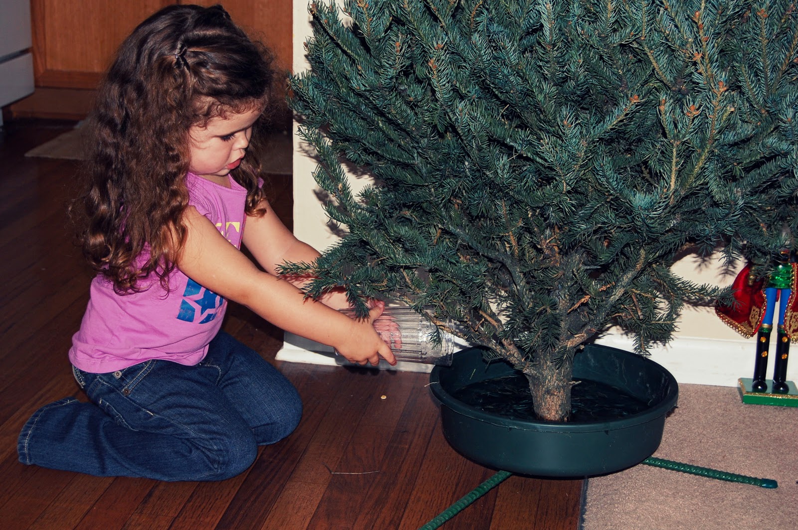 Before we could decorate, we had to water the tree. Lily took this job VERY seriously.